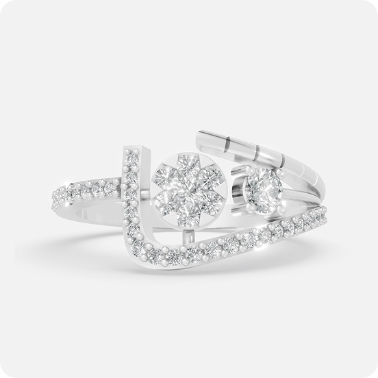 This avant-garde ring is a masterpiece of asymmetrical design, featuring a prominent “J” shaped architectural frame. The frame is meticulously set with shimmering pavé diamonds that sweep across the finger. At the center of the open-space design sits a brilliant round diamond cluster, creating the illusion of a single, larger focal stone. Adjacent to this cluster is an additional round-cut diamond held in a structural bezel, while a tiered, high-polished metal ribbon provides a modern, industrial finish to the upper portion of the band.