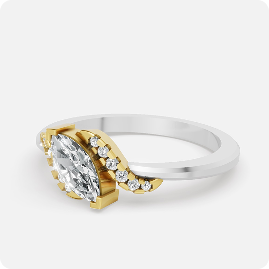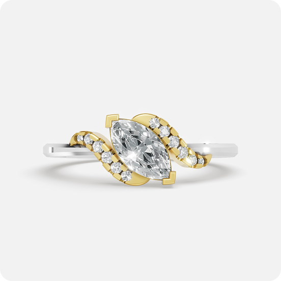 This striking architectural piece centers around a brilliant marquise-cut diamond, held securely in place by modern V-tip prongs. The design features a bold, high-contrast bypass shank where a sleek white gold band meets a radiant yellow gold ribbon. This golden ribbon curves elegantly around the central stone, encrusted with a shimmering row of pavé diamonds that add a sense of movement and celestial fire to the overall composition.