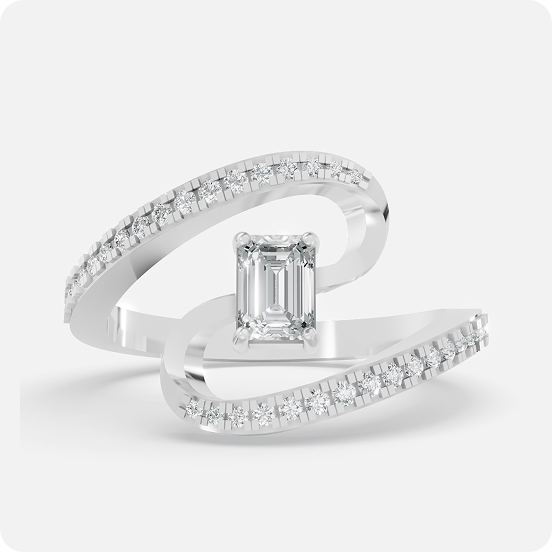 A modernist masterpiece that celebrates architectural symmetry and clean lines. This ring features a brilliant cushion-cut diamond secured in a classic four-prong setting. The true character of the piece lies in its unique shoulders, which feature high-polished, heart-shaped (or shield-style) geometric stations that lead into smaller, pyramid-shaped accents set with round brilliant diamonds. This design offers a sophisticated, structural look that is both bold and feminine.