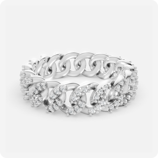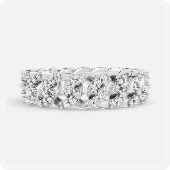 This stunning Cuban link–style diamond band ring blends modern luxury with timeless elegance. Featuring alternating high-polish links and pavé-set diamond links, the ring delivers a bold yet refined look.