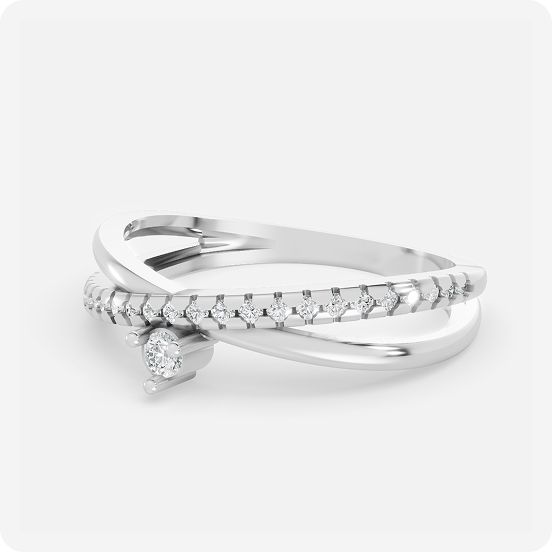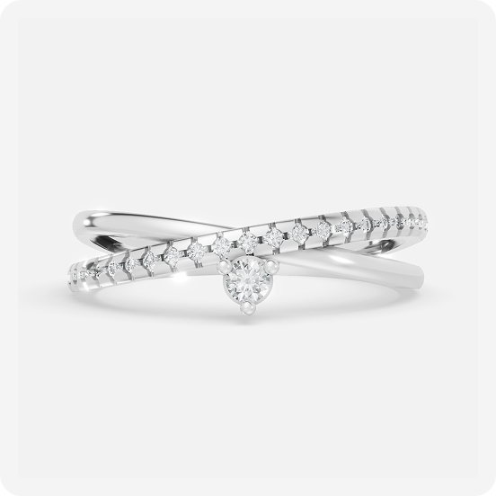 A sleek crossover diamond ring crafted in 18K white gold, featuring a micro-set diamond band and a delicate center drop diamond. Stylish, modern, and perfect for everyday elegance.