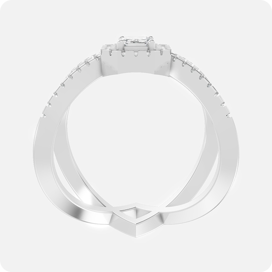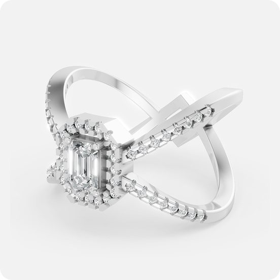 This avant-garde statement ring features a striking “X” shaped bypass architecture that provides exceptional finger coverage and a modern, geometric aesthetic. At the center of the intersection sits a sophisticated emerald-cut diamond, framed by a brilliant pavé-set halo that enhances its linear facets. The four arms of the “X” are delicately encrusted with shimmering round diamonds, creating a continuous flow of light that bridges the gap between classic bridal elegance and contemporary fashion.