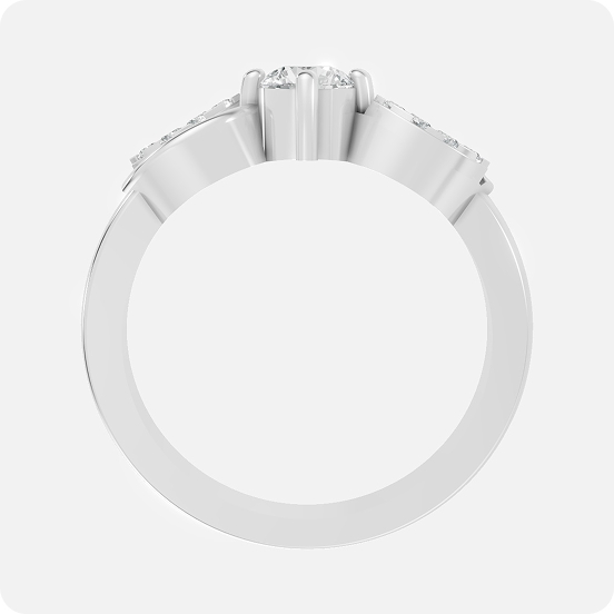 This elegant piece is a celebration of organic symmetry and modern romance. At its heart sits a brilliant round-cut diamond, secured by a classic four-prong setting. The centerpiece is beautifully framed by two symmetrical “leaf” motifs, each encrusted with a cluster of shimmering pavé diamonds. These floral-inspired accents are joined by sweeping, high-polished gold ribbons that cross in a fluid infinity-style wave, creating a balanced and multi-dimensional silhouette.