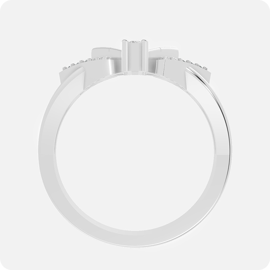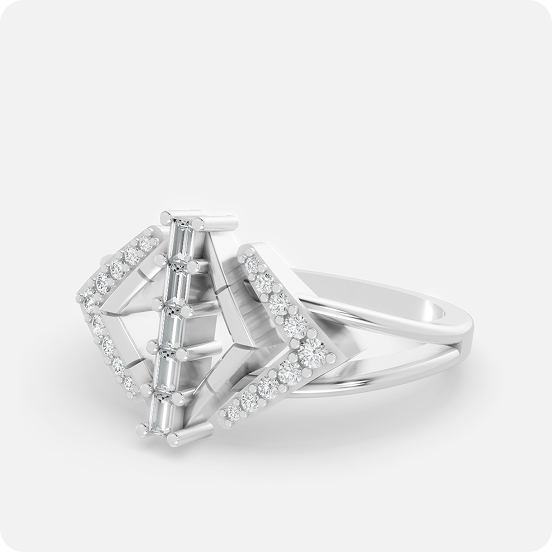 A striking example of modern industrial elegance, this ring features a bold, vertical “totem” of linear diamonds. The centerpiece consists of four graduated baguette-cut diamonds stacked vertically, held within a sleek, architectural frame. This central column is flanked by two symmetrical, diamond-shaped wings, each meticulously set with round brilliant pavé diamonds. The open-space geometry and split-shank band create a voluminous, high-fashion look that remains airy and balanced.
