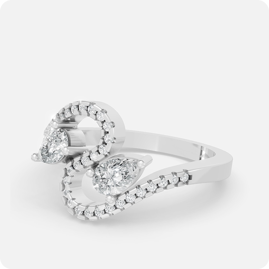 This architectural masterpiece features a dynamic, triple-band bypass structure that creates a sense of infinite movement. At its center, a cluster of five brilliant pear-cut diamonds are arranged in a floral, stellar-inspired formation. The central motif is embraced by two outer ribbons encrusted with shimmering pavé diamonds, while a third high-polished band weaves through the center, adding a sophisticated layered depth to the design.