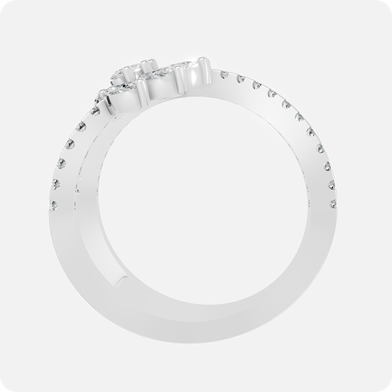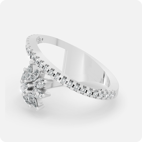 This high-jewelry statement piece draws inspiration from the blooming lotus flower, symbolizing purity and rebirth. The design features a magnificent asymmetrical bypass architecture where a pave-set diamond band sweeps elegantly over a lush, multi-petaled marquise diamond blossom. The “lotus” is meticulously composed of several brilliant marquise-cut diamonds that radiate outward from a central round brilliant core, creating a dramatic and three-dimensional floral display.