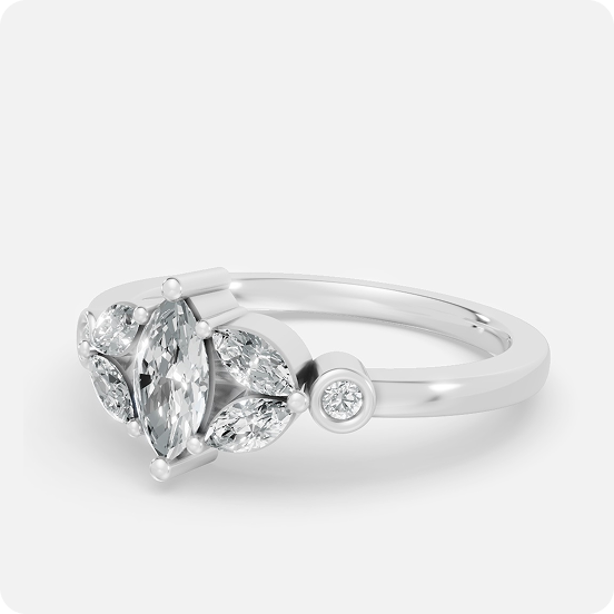 Setting Style: Bezel-set for the round accents and prong-set for the marquise petals