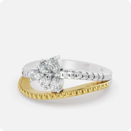 A masterclass in horizontal symmetry, this ring features an avant-garde “wave” of four Pear-cut diamonds that appear to float above a split bypass band. The architectural design uses tiered elevations to create depth, with a lower high-polished ribbon supporting a pavé-encrusted bridge that curves gracefully beneath the marquise cluster. It is a bold, directional piece that reimagines the traditional multi-stone ring with sharp, clean lines.