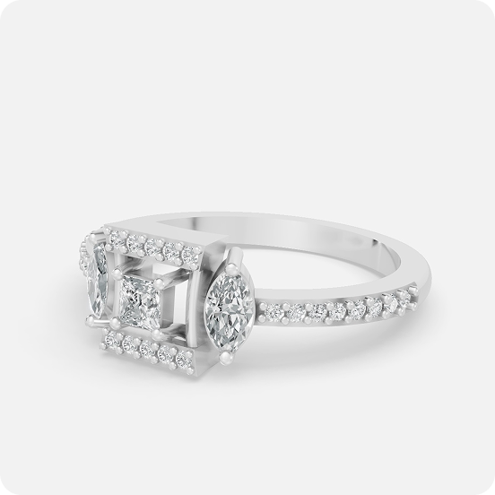 A definitive statement in modern geometric luxury, this ring features a central princess-cut diamond suspended within a bold rectangular frame. The architectural head is flanked by two brilliant marquise-cut diamonds, creating a distinctive “three-stone” silhouette with a contemporary edge. The central frame is meticulously lined with shimmering pavé-set round diamonds, which continue along the slim, high-polished band for a seamless flow of brilliance.