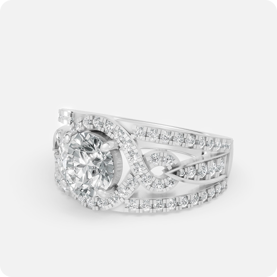 This wide-band ring features a round cut center stone secured in a classic prong setting, surrounded by a refined halo of round diamonds. The band showcases an intricate open-link design with diamond accents, creating depth, brilliance, and strong visual balance. Crafted for those who prefer a bold yet timeless look, this ring combines structure, sparkle, and everyday wear comfort.