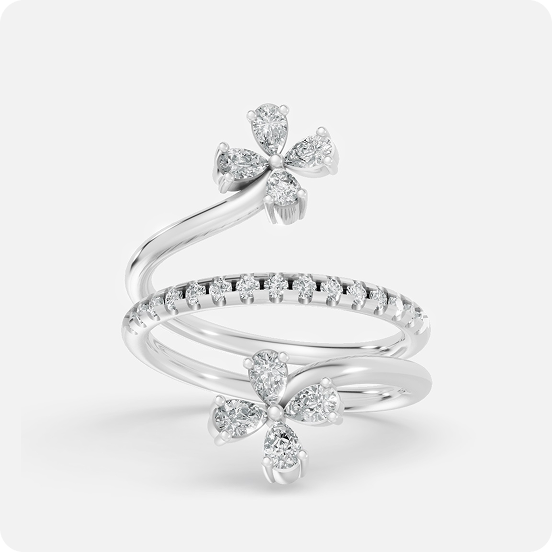 This enchanting statement piece features a dynamic triple-tier spiral architecture that wraps the finger in a garden of light. The ring showcases two delicate “four-petal” blossoms, each meticulously crafted from brilliant pear-cut diamonds that meet at a central round-diamond bud. These flowers are set at the terminals of a high-polished bypass frame, while the central tier is encrusted with a continuous row of shimmering pave diamonds. The open-space design and fluid curves offer a sophisticated, high-fashion take on traditional floral motifs.