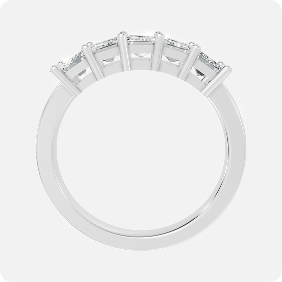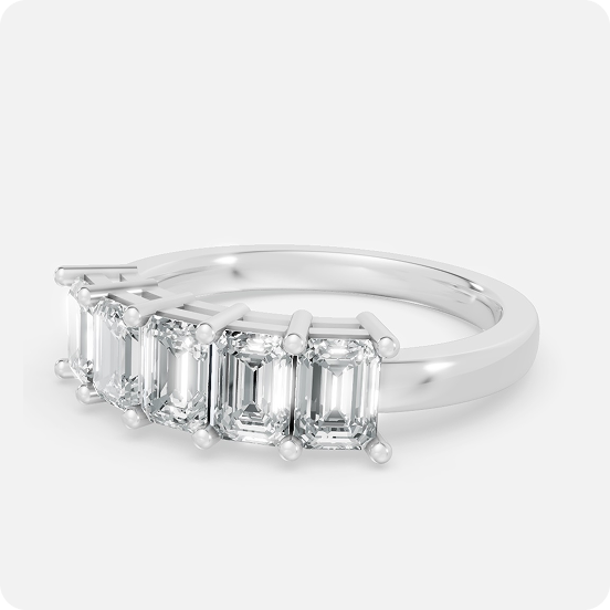 Exuding an aura of high-fashion sophistication, this masterpiece from Red Royal Jewelry features a striking linear sequence of five premium emerald-cut diamonds. Each stone is meticulously selected for its “hall-of-mirrors” step-cut faceting, creating a clean and architectural rhythmic brilliance. Secured by a specialized multi-prong gallery that emphasizes their rectangular silhouettes, this band offers a bold, geometric alternative to traditional round-stone designs, embodying the pinnacle of modern luxury.