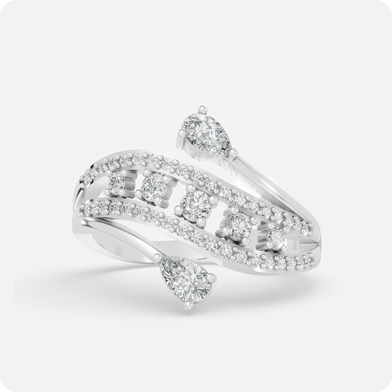 This sophisticated bypass ring features a stunning, dynamic design with multiple rows of pavé-set diamonds that sweep elegantly across the finger. The modern structure is punctuated by larger, strategically placed diamonds, including two dazzling pear-cut stones anchoring the design at opposite ends. This highly visual ring is a contemporary masterpiece, perfect as a fashion statement or a significant anniversary gift.