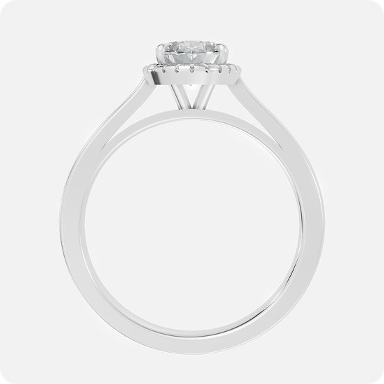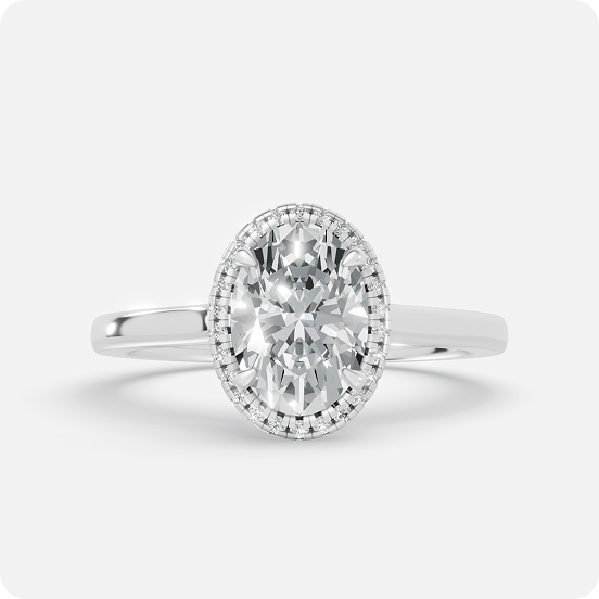 Exuding timeless grace and contemporary structure, this solitaire features a brilliant oval-cut center diamond framed by a meticulously crafted architectural halo. The halo is designed with a unique scalloped metal perimeter that secures each accent stone while providing a clean, geometric frame for the primary gem. Set upon a sleek, high-polished cathedral band, the mounting is elevated to allow light to permeate the diamond from every direction, maximizing its natural fire and brilliance.