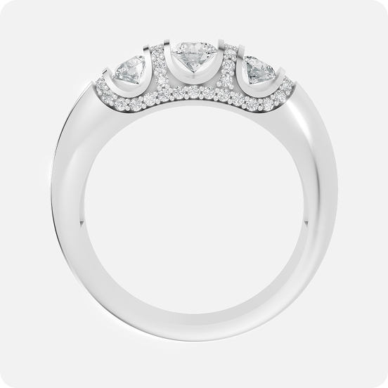 A daring exploration of negative space and linear precision, this open-front ring challenges traditional jewelry geometry. On one side of the “break” sits a sharp, brilliant trillion-cut diamond held in a structural bezel-prong hybrid setting. Opposite it, the band terminal splits into a geometric, hollow rectangular frame encrusted with two parallel rows of precision pavé diamonds. This architectural gap creates a captivating visual tension, making the trillion-cut stone appear to float toward a diamond-lined horizon.