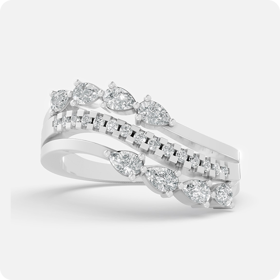 This high-jewelry statement piece features a dramatic triple-band construction that wraps the finger in a garden of light. The design is composed of three distinct architectural tiers: two outer bands adorned with graduating pear-cut diamonds arranged in a blooming “vine” pattern, and a central structural band set with a continuous row of shimmering round diamonds. The open-space gallery between tiers creates an airy, sophisticated look while providing substantial vertical coverage on the hand.