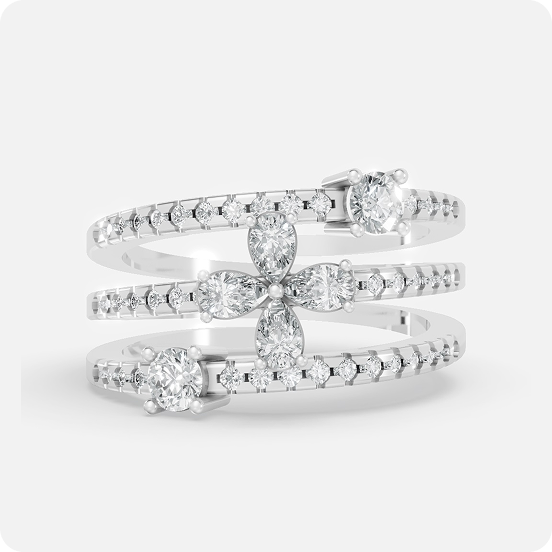 This sophisticated statement ring features a modern triple-band structure that creates an expansive, layered look on the finger. The design centers around a radiant four-petal floral motif crafted from pear-cut diamonds. This central blossom is flanked by two additional round brilliant diamonds set on the upper and lower tiers, all connected by shimmering pavé-set ribbons. The open-space architecture between the bands provides a light, airy aesthetic while delivering maximum visual impact.
