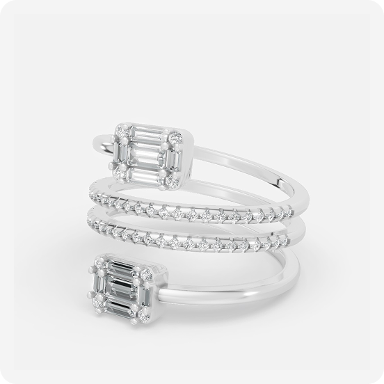 This luxurious spiral wrap ring features two stunning baguette-cut diamond clusters placed at each end of the open design. The elegant wrap is beautifully accented with a line of shimmering round diamonds, crafted in rich 18K Yellow Gold.